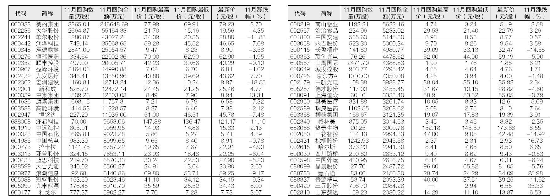 根据Wind数据统计,截至11月14日,11月已有220家公司实施回购,其中,54家公司回购金额超过2000万元。从二级市场来看,三元股份、壹石通、棕榈股份等股股价11月涨幅居前。